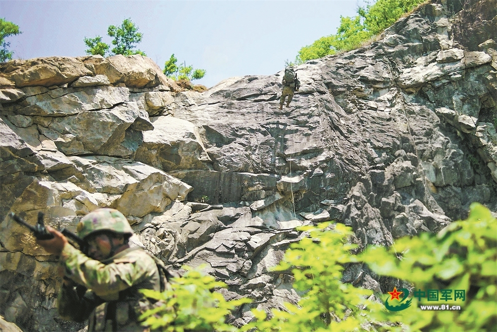 然而,侦察小队没有迟疑。在指挥员刘祖博指挥下,侦察小队很快行动起来。抓握绳索、脚踩岩点、身体贴近岩壁,每个人的动作都很流畅,很快通过了陡崖。